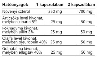 | | Összetevők: növényi szterol, kapszula anyaga: zselatin, articsóka (Cynara scolimus) levél kivonat, fokhagyma (Allium sativum) gumó kivonat, olajfa (Olea europea) levél kivonat, gránátalma (Punica granatum) termés kivonat, magnézium-sztearát (csomósodásgátló)